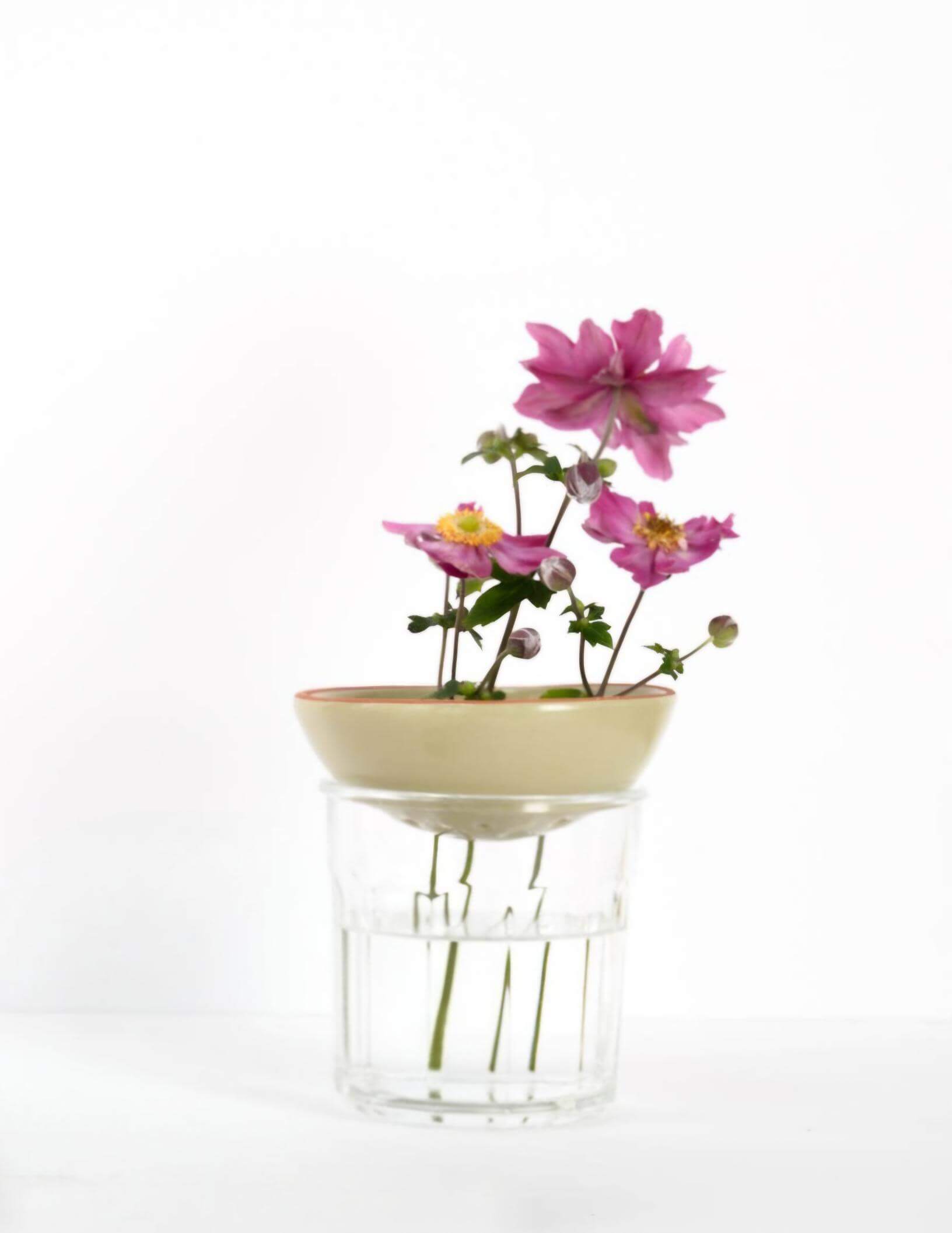 Je kunt de Bobèche ook omdraaien in een schaal met water om een laag, rustig bloemenarrangement te maken — super leuk op tafel of als decoratie in een vensterbank.