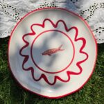 Breng kleur en zomerse sfeer aan tafel met het Ariane dinerbord van Mica Decorations. Dit handgemaakte bord is een echte blikvanger, met een vrolijke visprint en een speels patroon langs de rand – een combinatie van een rode cirkel en een golvend detail.