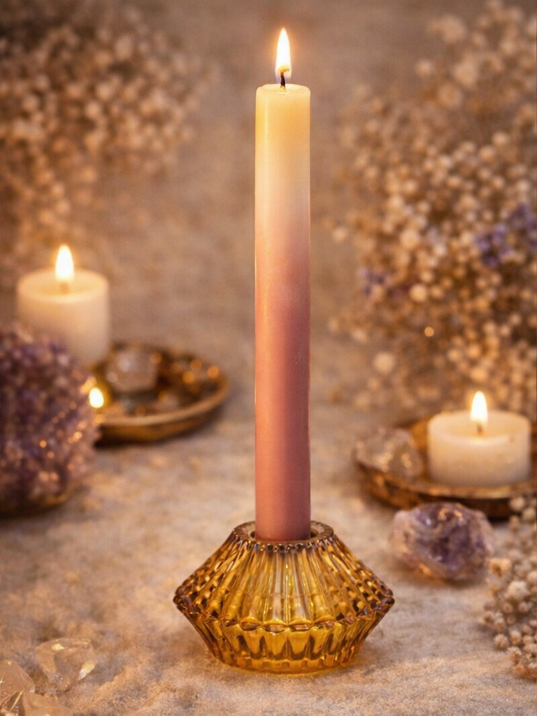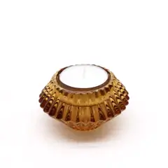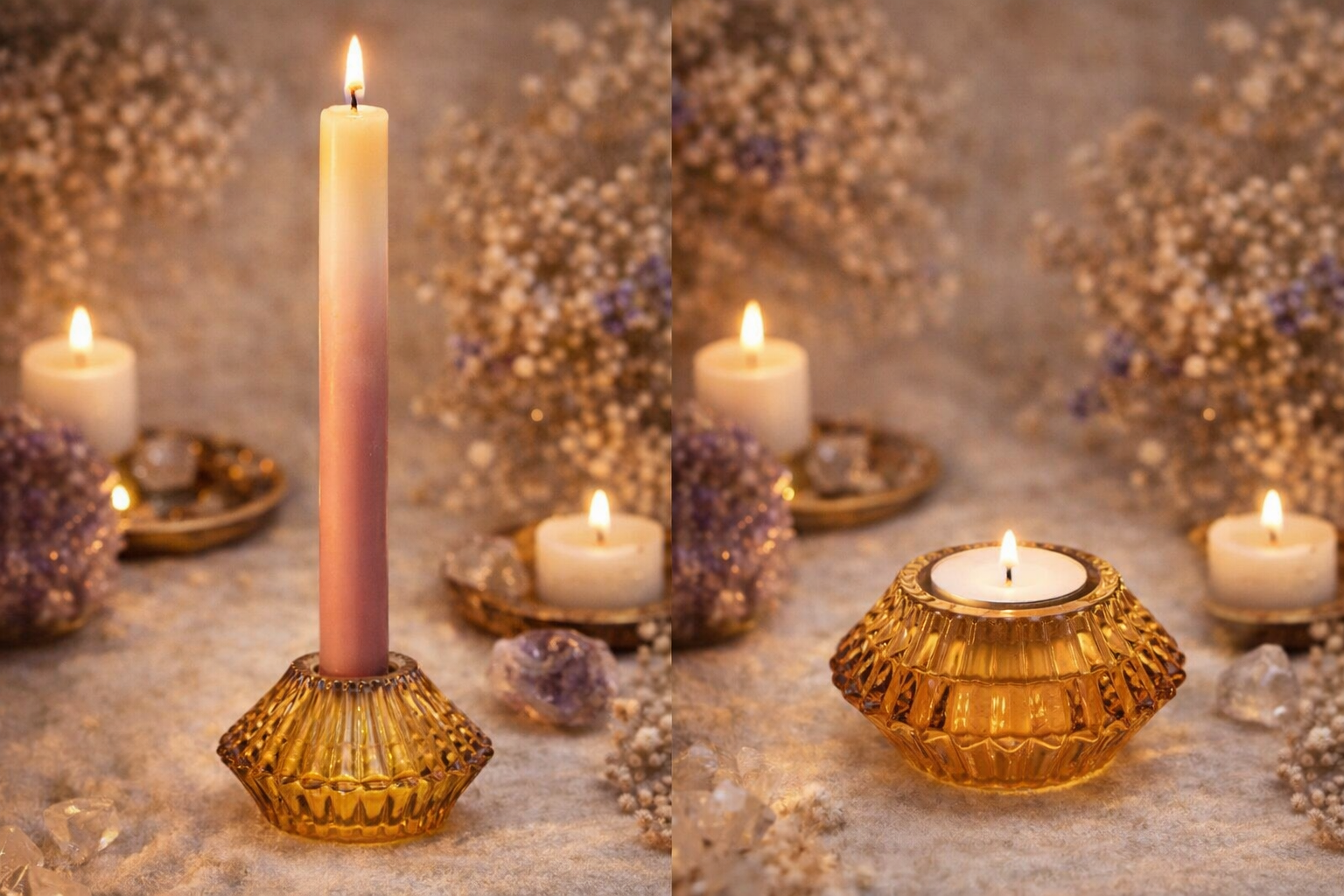 Het antiek amberkleurige glas vangt het kaarslicht op een warme manier en zorgt direct voor een knusse, luxe sfeer. De bloemvormige details geven ‘m net dat beetje extra karakter, zonder druk te worden. Perfect voor een gedekte tafel, een cozy hoekje of als subtiel accent in je interieur.