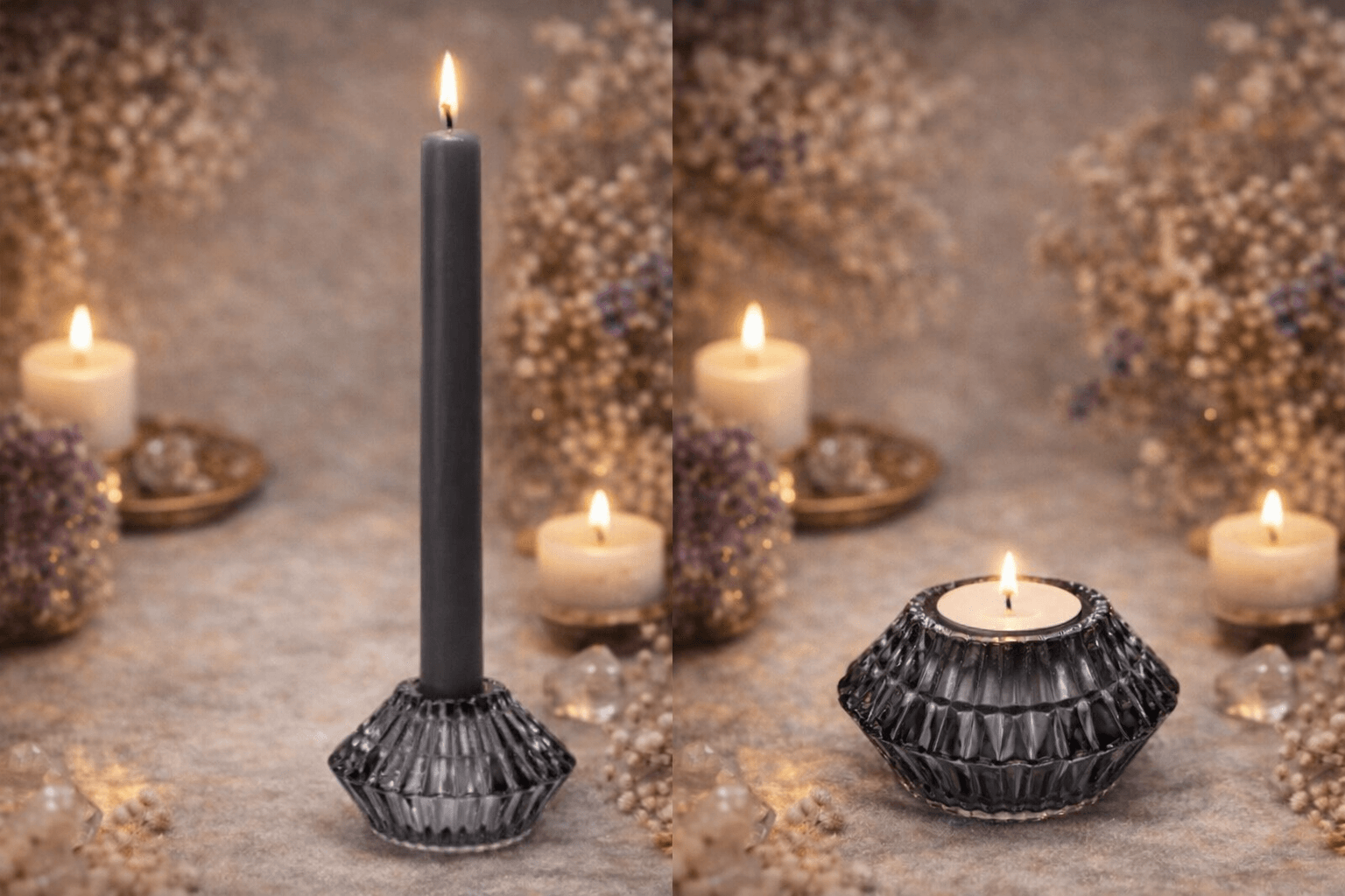 De diepe, donkergrijze tint geeft deze houder een rustige maar krachtige uitstraling. Perfect voor wie houdt van een minimalistische look met karakter. Het bloemvormige glas vangt het kaarslicht prachtig en zorgt voor een warme gloed, zonder dat het te zacht of zoet wordt.