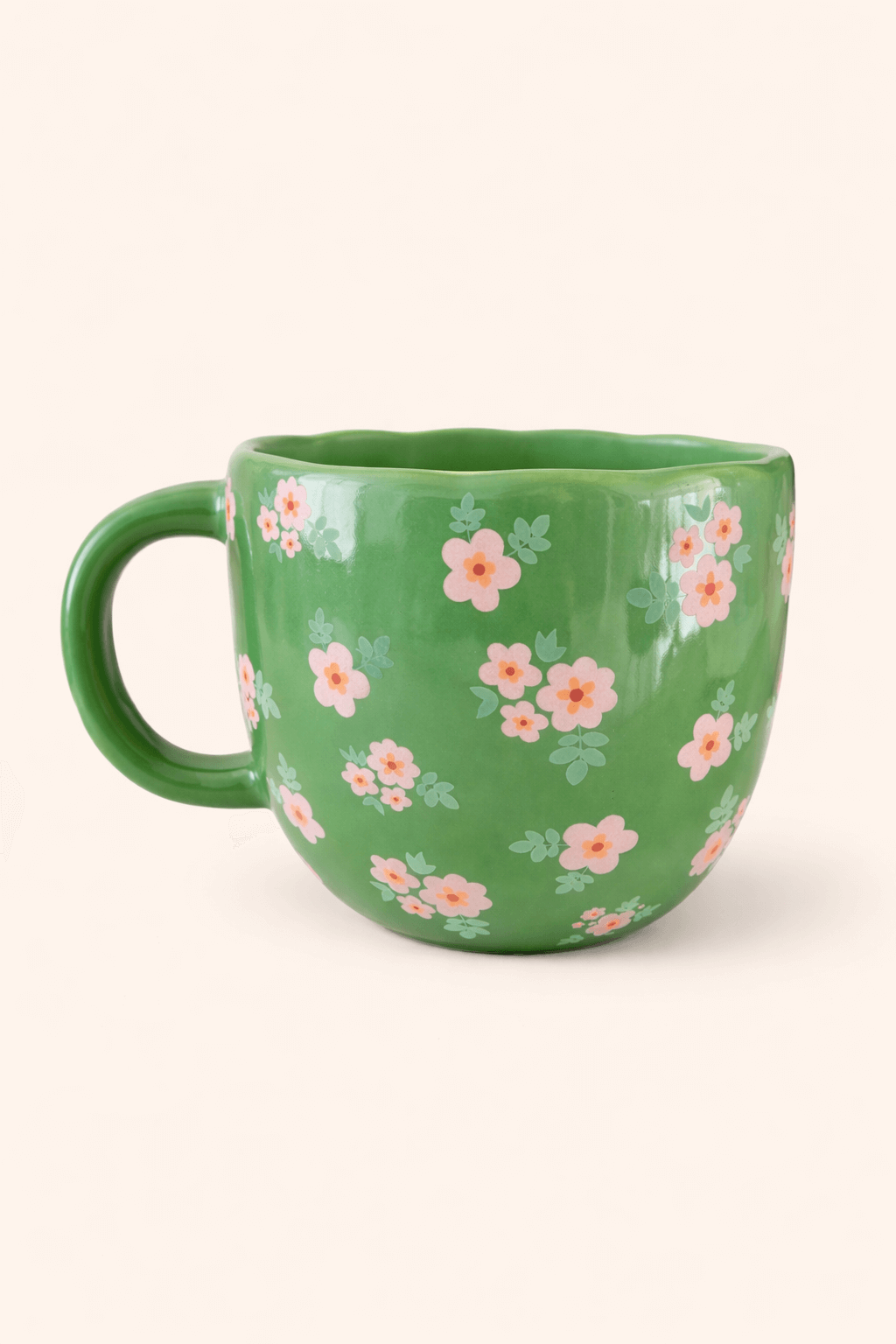 Op het eerste gezicht een lieve, groene mok met mooi geschilderde bloemetjes. Rustig, vrolijk en perfect voor je favoriete thee of koffie.