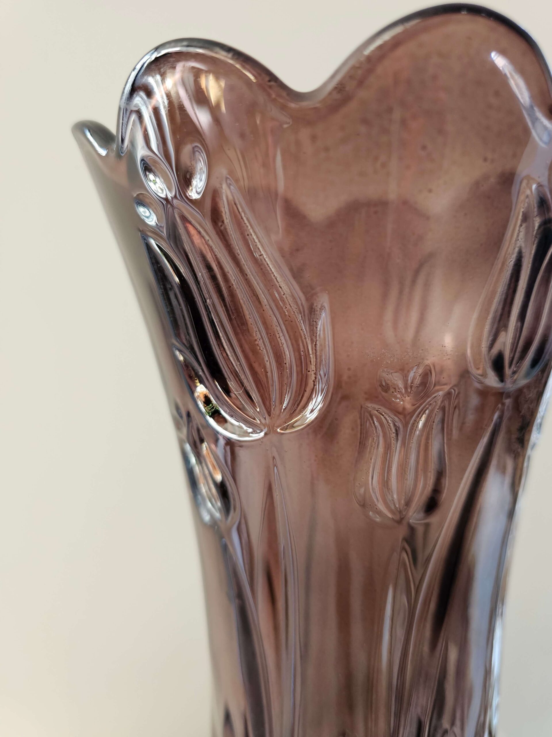 Deze donkere vaas geeft meteen een warme, chique sfeer aan je interieur. Het elegante tulpenpatroon komt extra mooi naar voren in het dikke glas, waardoor de vaas ook zonder bloemen al een echte blikvanger is.