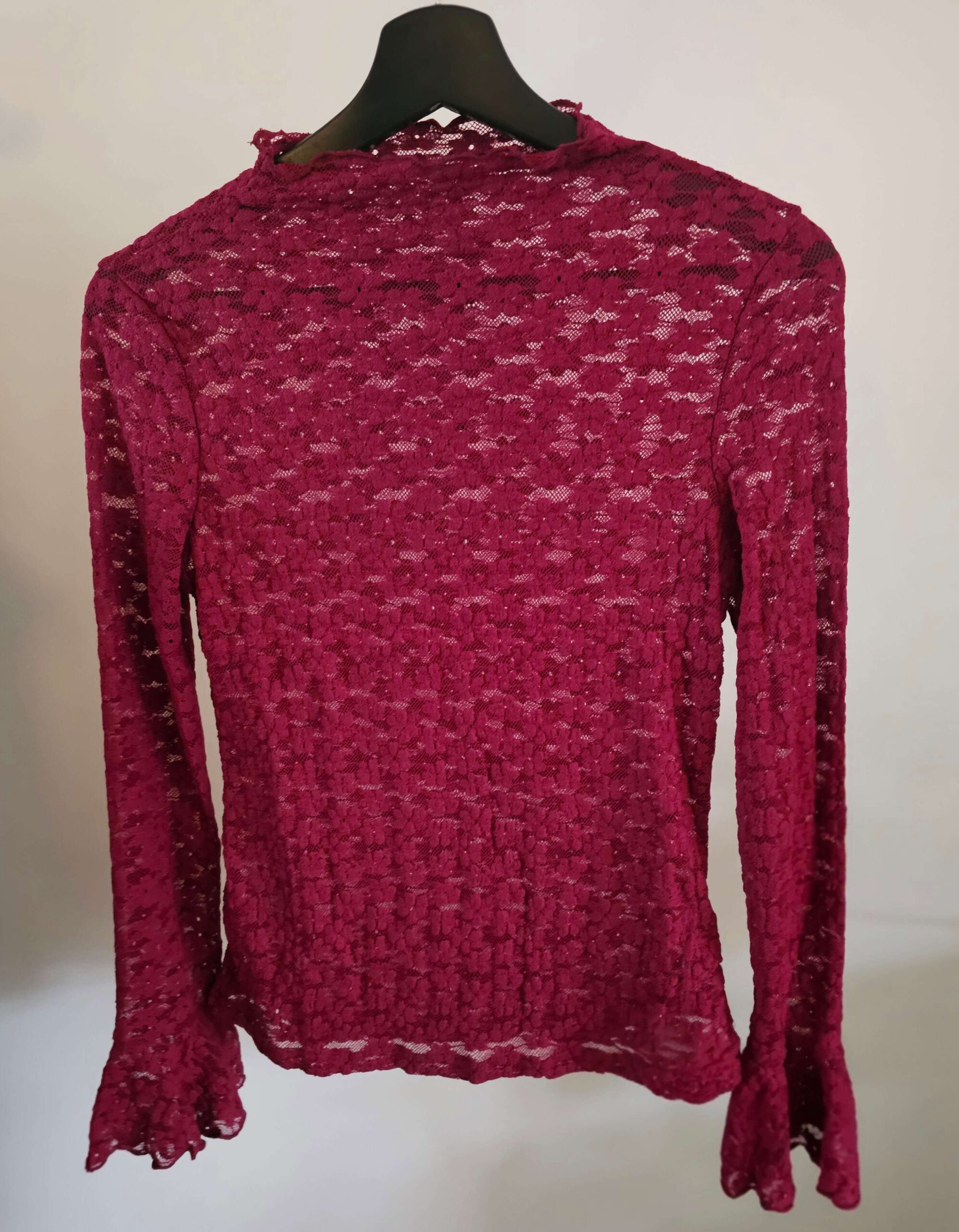 Deze kanten top is zo’n item dat meteen iets doet voor je outfit. De diepe kleur is warm, chic en net even anders dan standaard zwart. Het fijne kant geeft ’m een romantische touch, terwijl de wijd uitlopende mouwen met ruches voor een subtiel statement zorgen (hello drama, maar dan elegant).