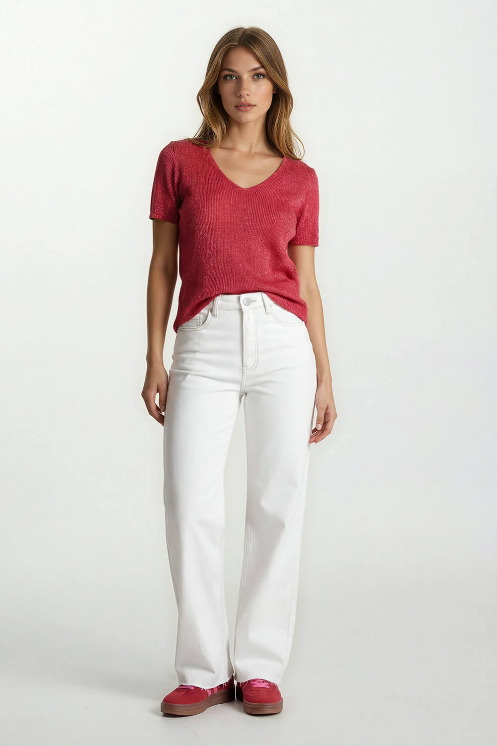 Dit is zo’n topje dat je outfit meteen laat stralen. De mooie koraalkleur geeft een frisse, warme uitstraling en het subtiele lurex draadje zorgt voor een zachte sparkle.