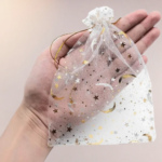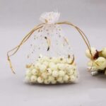 Voeg een vleugje elegantie toe aan je cadeaus of traktaties met deze witte organza zakjes met een stijlvolle gouden print. De handige trekkoordsluiting zorgt voor een feestelijke afwerking Ên praktisch gebruik.