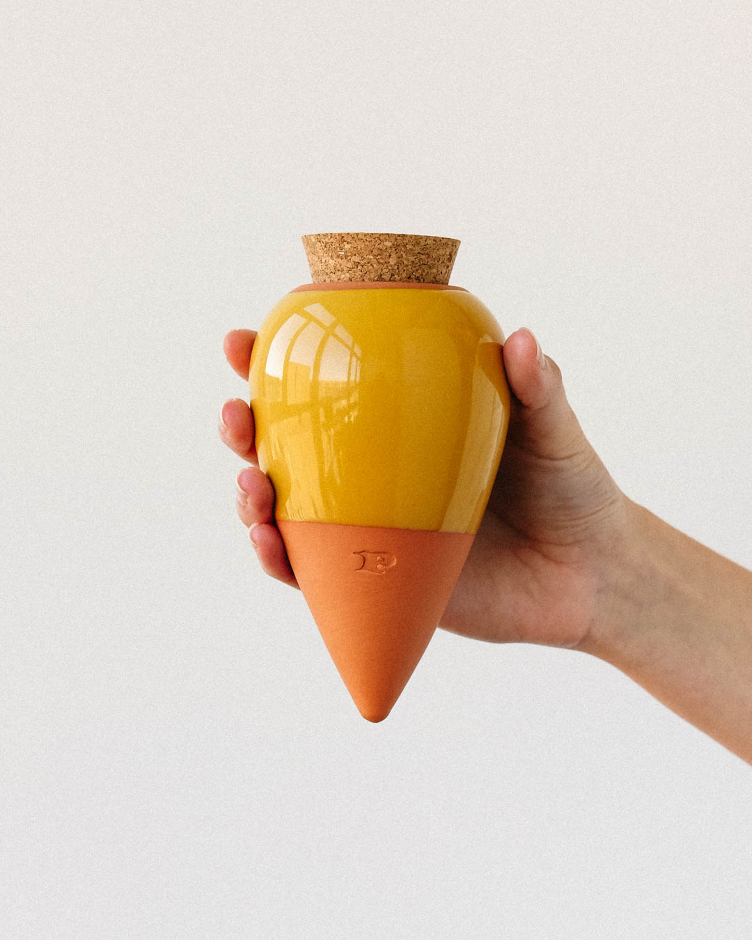 De buitenkant is prachtig afgewerkt in een warme mosterdgele kleur met terracotta punt, afgesloten met een kurken dop. Een mooi design object dat functioneel net zo sterk is als decoratief.