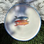 Breng de zomer naar je tafel met het Ariane ontbijtbord van Mica Decorations! Dit charmante bord is met de hand gemaakt van hoogwaardig steen en heeft een frisse witte basis, afgewerkt met een speelse blauwe rand en drie vrolijke visjes in het midden – dé perfecte mix van stijl en gezelligheid.