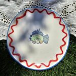 Breng kleur en sfeer aan je tafel met dit handgemaakte ontbijtbord uit de Ariane-lijn van Mica Decorations. De frisse witte basis, versierd met een vrolijk visje en een speels patroon van blauwe cirkels en rode golvende lijnen, maakt dit bord dé eyecatcher voor je zomertafel.