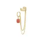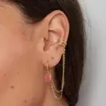 Trend Alert!! Hoe gaaf is deze gouden oorbel met earcuff met roze steen in één! De oorbel en earcuff zijn verbonden door een subtiel kettinkje, super leuk! De oorbel heeft een vrolijke & speelse uitstraling en is daardoor makkelijk te combineren met verschillende sieraden! De oorbel is gemaakt van roestvrij staal in combinatie met steen en hebben een afmeting van 10,5 cm.