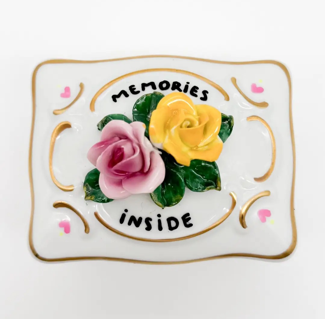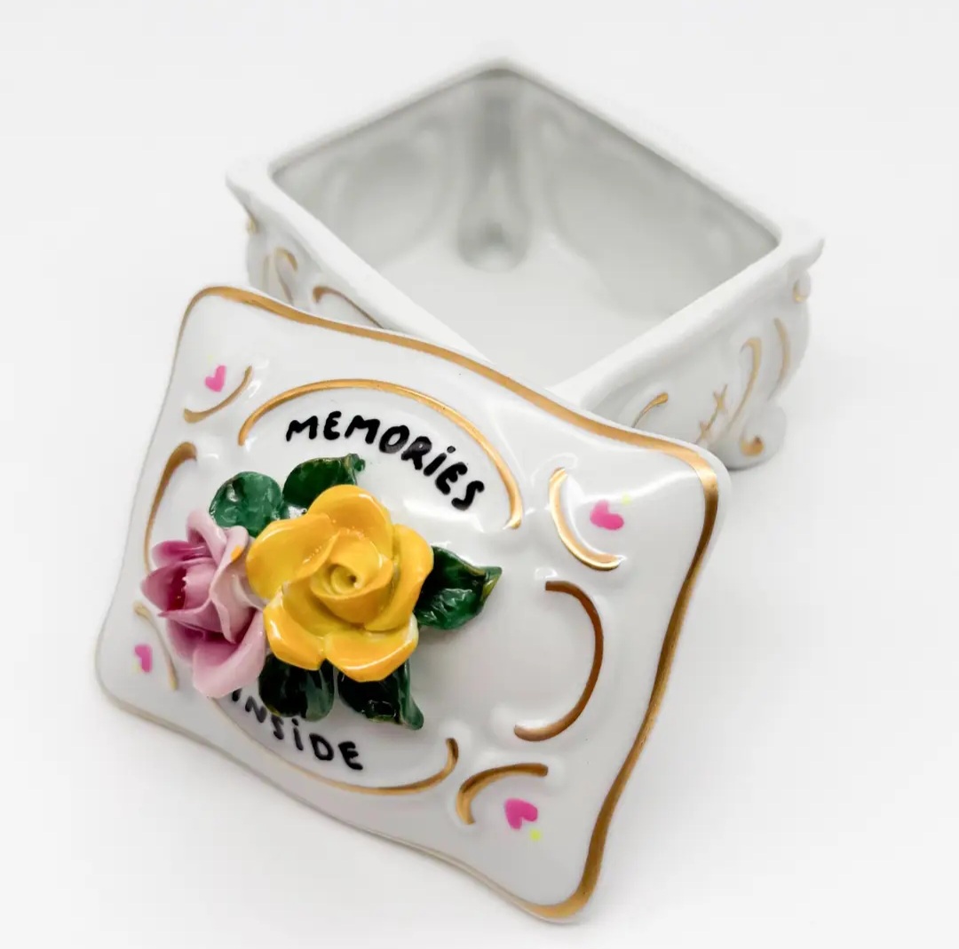 Wat een FANTASTISCH item weer dit!! Een klein doosje met een groot verhaal. Dit bijzondere sieradendoosje is echt een klein kunstwerkje. Versierd met bloemen, hartjes en de tekst “Memories Inside” — alsof het speciaal gemaakt is om mooie herinneringen te bewaren.