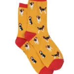 Voeg wat vrolijkheid toe aan je sokkenlade met deze comfortabele bamboesokken met schattige Beagle print! De kleuren mosterdgeel en rood maken ze extra opvallend en stijlvol.
