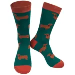 Deze elegante groene bamboesokken met schattige mini teckels zijn perfect voor de hondenliefhebber met gevoel voor stijl. Gemaakt van hoogwaardig, ademend bamboe, zodat je voeten de hele dag fris en comfortabel blijven.
