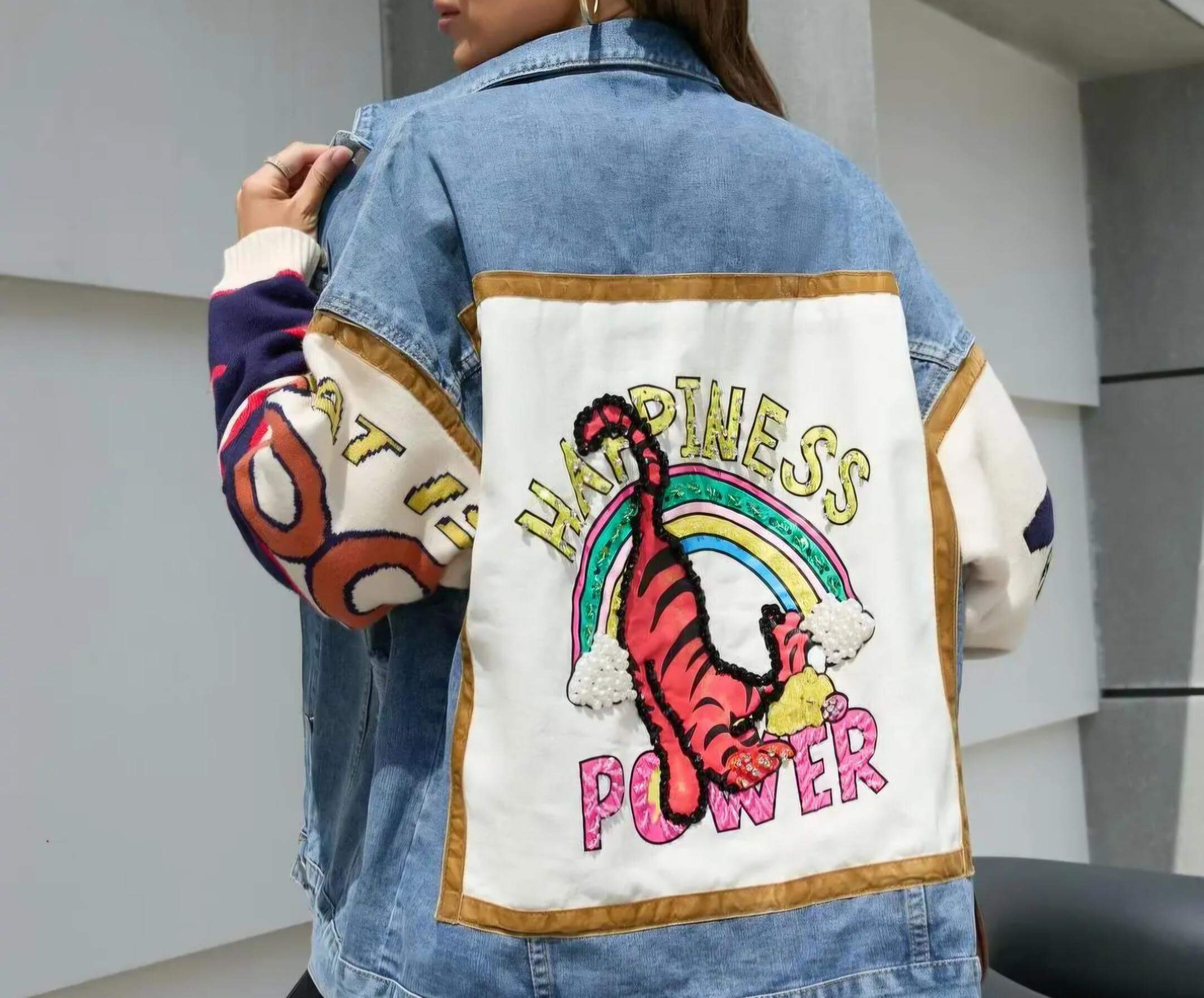 Tijgertje, een regenboog, bovenaan de tekst Happiness, onder de tijger Power. Afgewerkt met strass, diamantjes en parels voor een mega cool artsy effect. Dit jack wil gezien worden — van achteren én van voren.