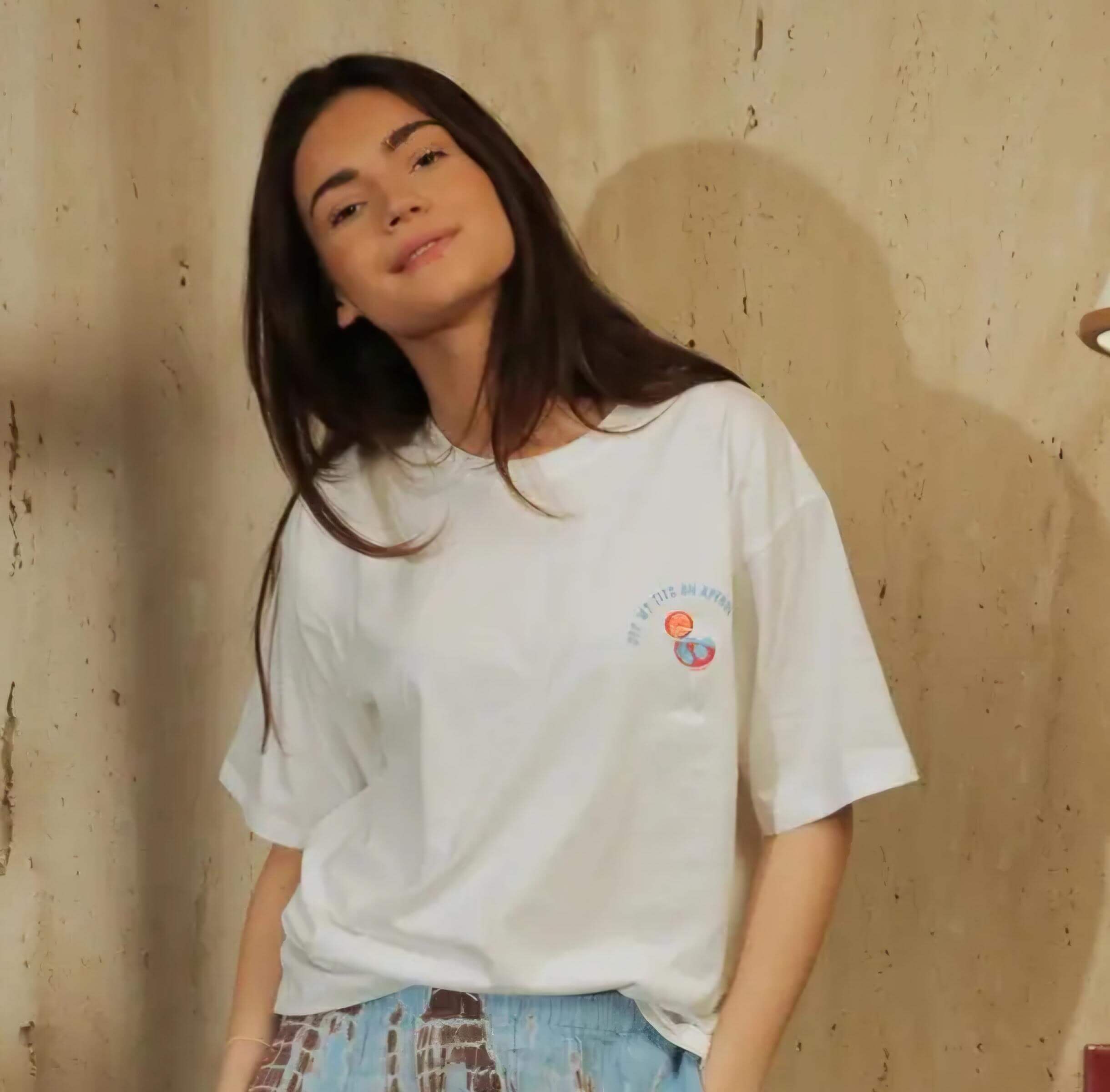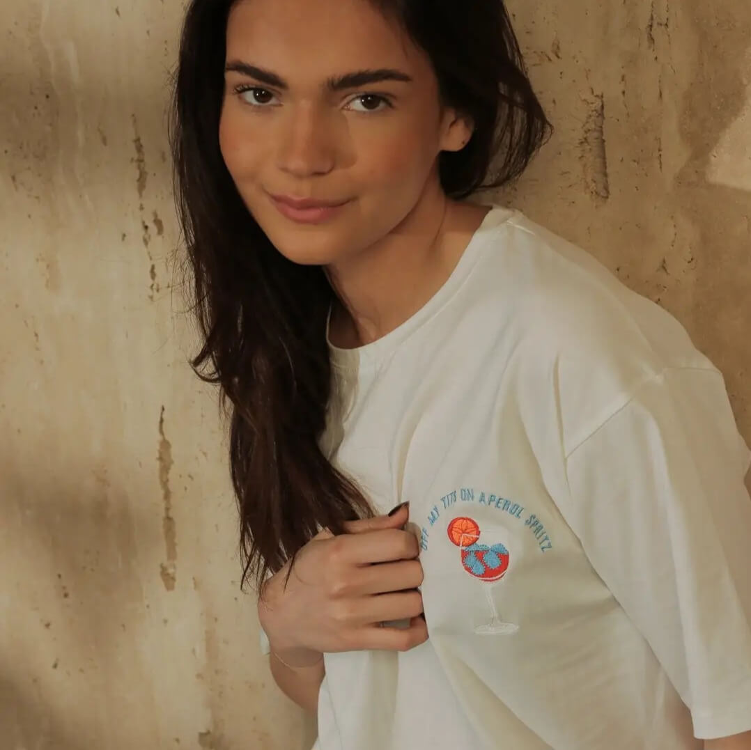 Lekker simpel wit shirt, maar met dat kleine geborduurde cocktailtje en die tekst… ja, dit is er eentje met karakter. Perfect voor een terrasje, vakantie vibes of gewoon omdat je er zin in hebt 🍹✨