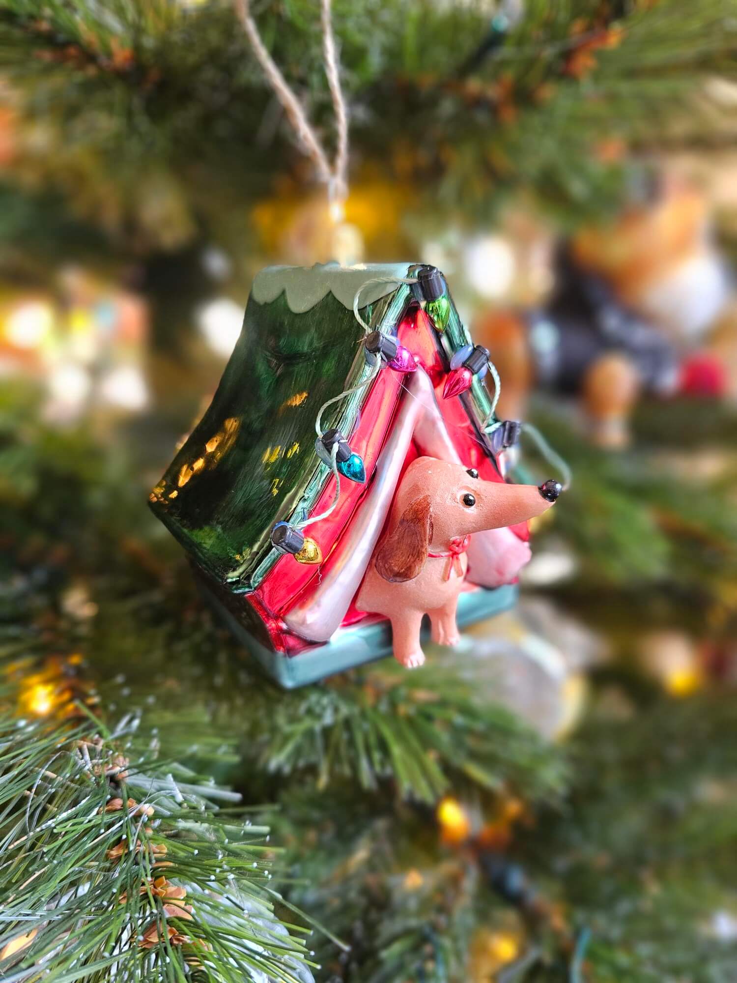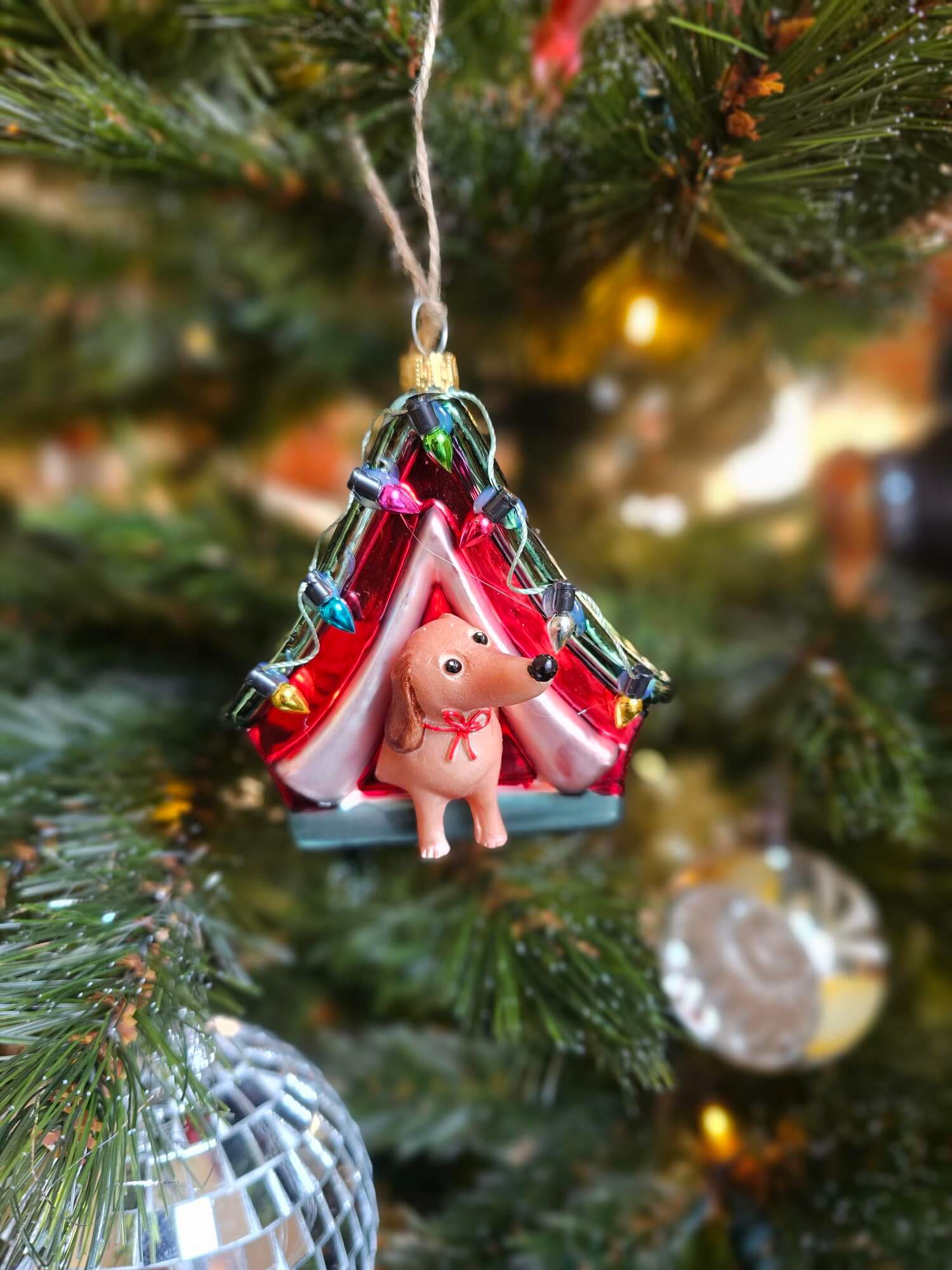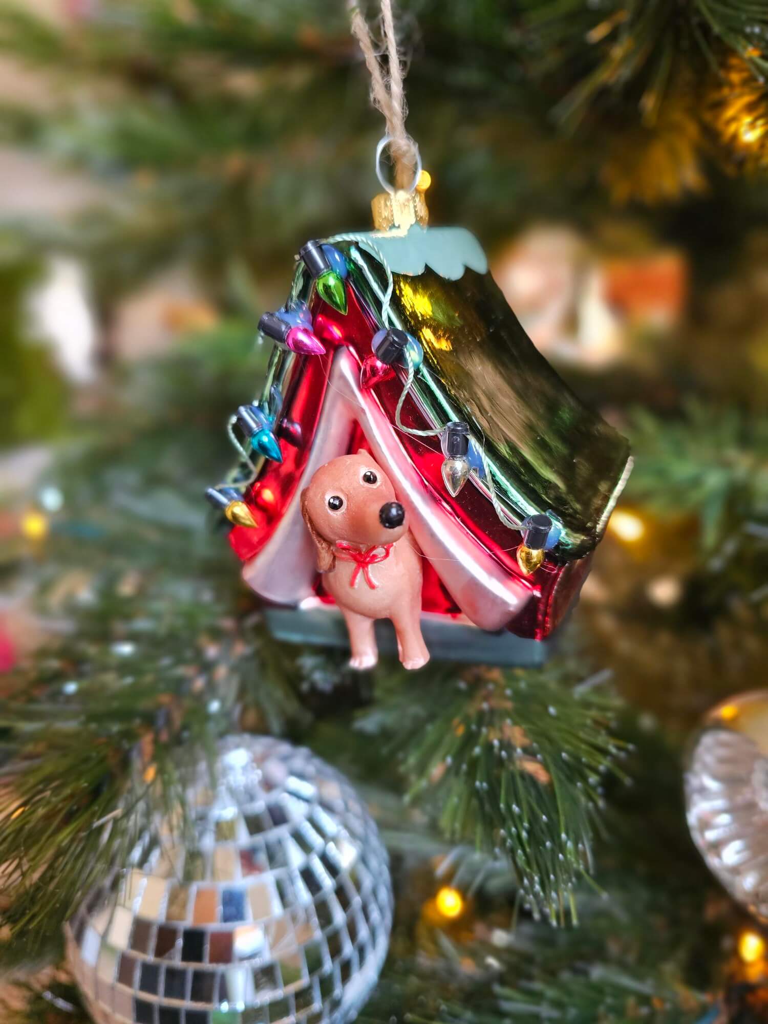 Deze glazen kerstbal laat een kleine teckel zien die nieuwsgierig met zijn hoofd en voorpootjes uit een groene kersttent piept — compleet met vrolijke, gekleurde kerstlampjes rondom de opening van de tent! Hoe leuk is dat?!