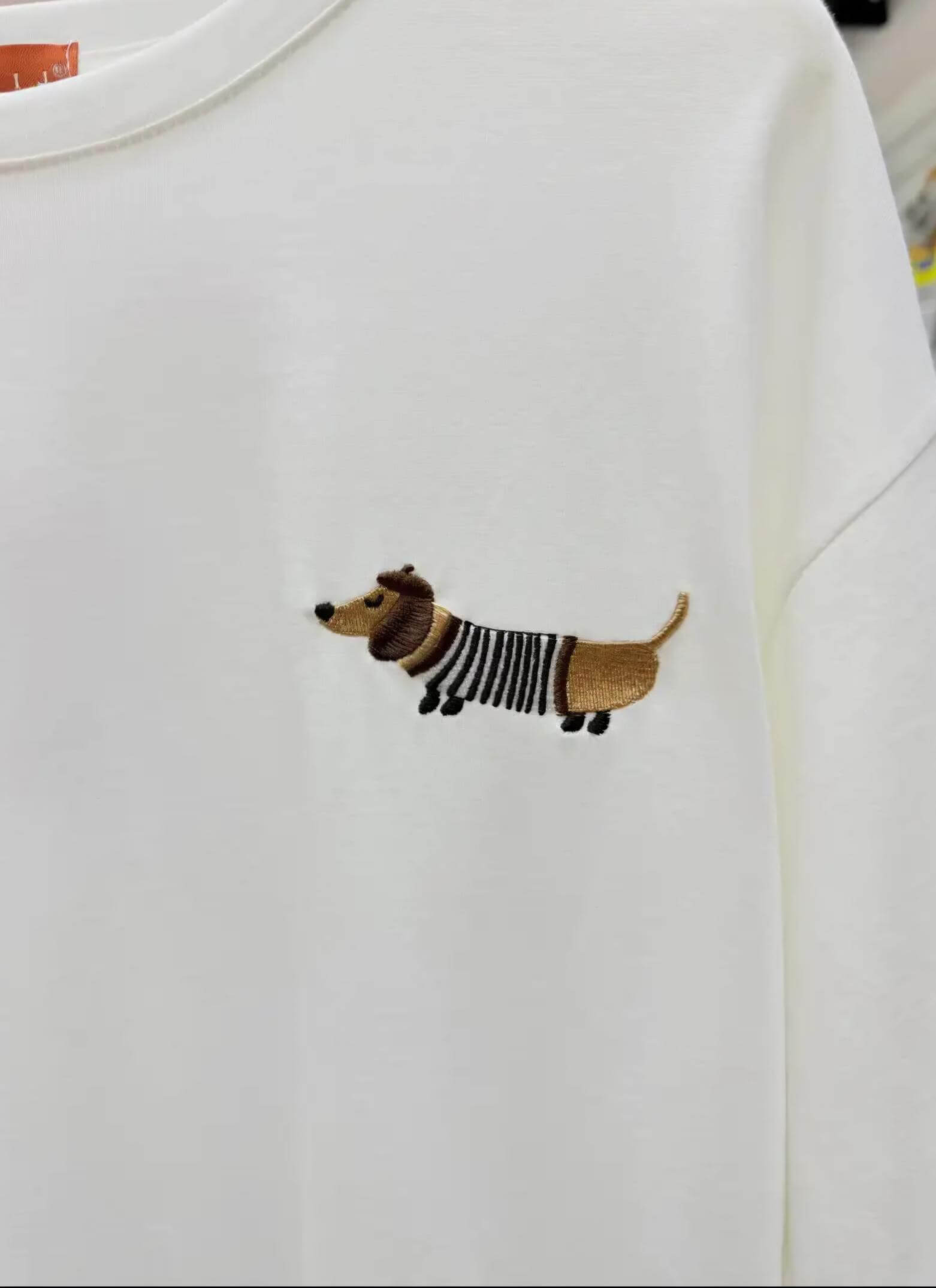 Een simpel wit T-shirt, maar dan met een detail waar je meteen blij van wordt: een geborduurde bruine teckel op de borst 🐾