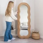 Het golvende ontwerp geeft de spiegel een unieke en moderne twist, waardoor het een opvallend decoratief stuk is dat elke kamer direct een trendy en uitnodigend gevoel geeft. Perfect voor in de hal, slaapkamer of woonkamer – deze spiegel voegt niet alleen functionaliteit toe, maar ook een vleugje verfijning en comfort.