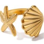 Breng de zee altijd met je mee met deze prachtige verstelbare ring, versierd met een schelp en zeester. Gemaakt van duurzaam stainless steel, is deze ring niet alleen stijlvol, maar ook bestand tegen water, verkleuring en dagelijks gebruik.
